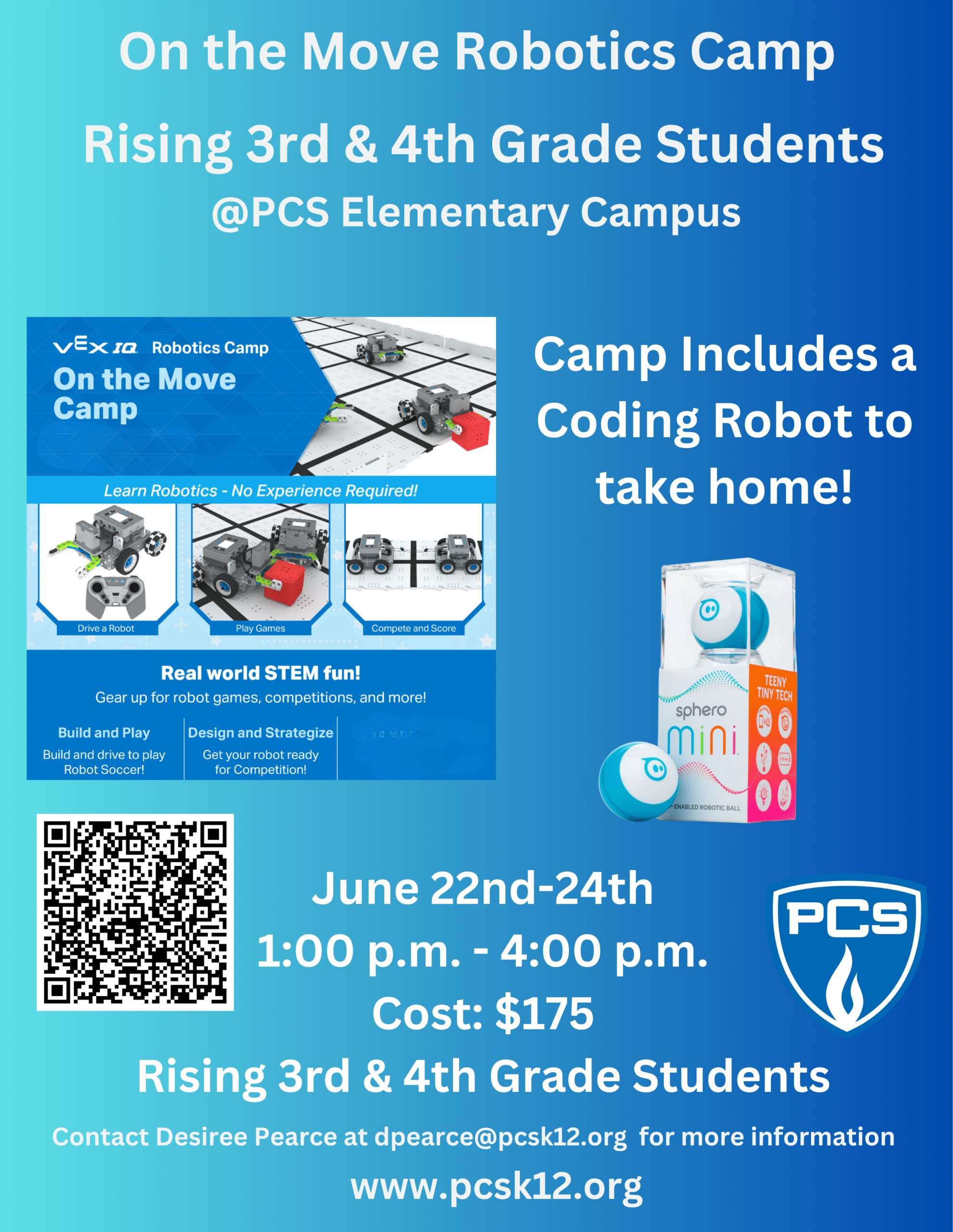Rising 3rd & 4th Grade Students- We are excited to have your camper join us for 2026 On the Move Robotics Camp. Camp registration includes a coding robot to take home!