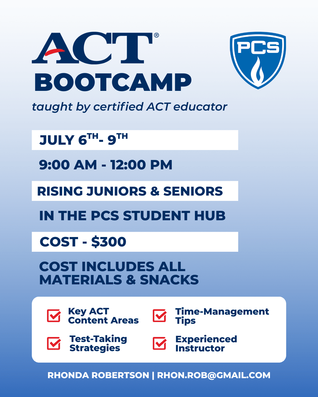 Rising Juniors & Seniors – Learn from certified ACT educator, Rhonda Robertson, study tips and strategies for taking the ACT. Registration closes May 21.
