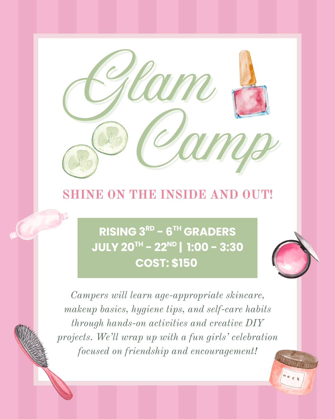 Glam Camp is a three-day camp for 3rd–6th grade students focused on confidence, self-care, and personal style. Each day features an age-appropriate lesson and hands-on activities centered on skincare, makeup, and helpful hygiene tips. Campers will enjoy creative DIY projects, group activities, and a fun glam celebration to close out the camp. All activities emphasize healthy habits, creativity, and confidence!