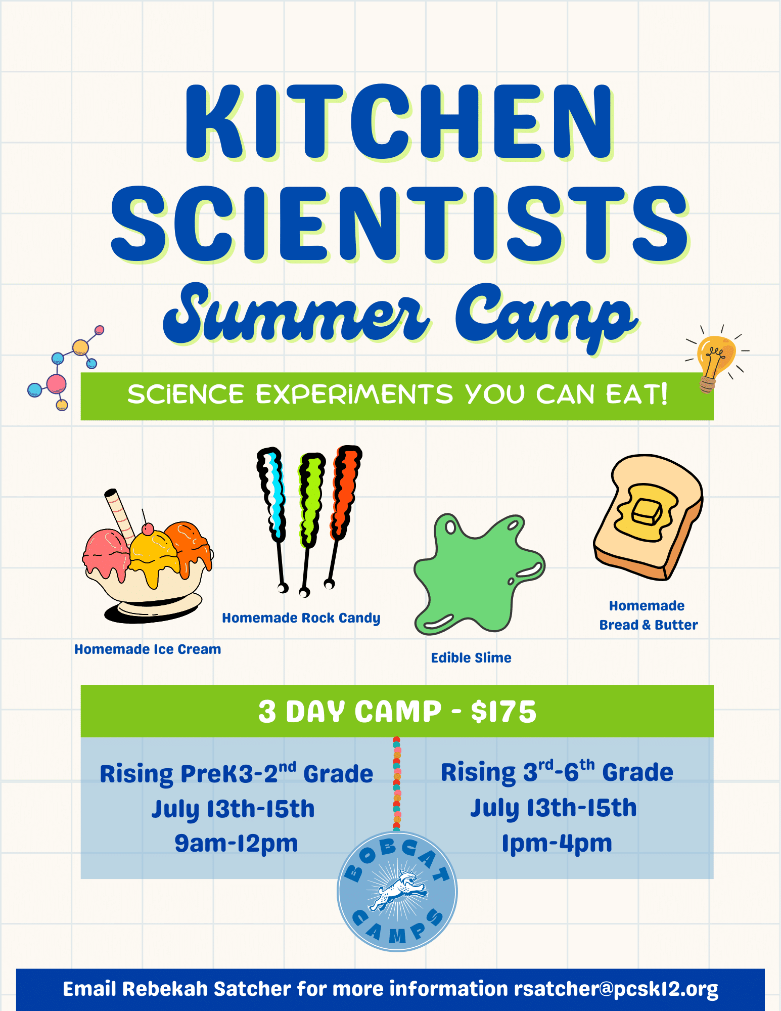 Rising K3-2nd Grade Students and Rising 3rd-6th Grade Students – Every day students will conduct science experiments that are completely edible. Experiments will include: edible slime, homemade ice cream, homemade bread and butter, and rock candy.