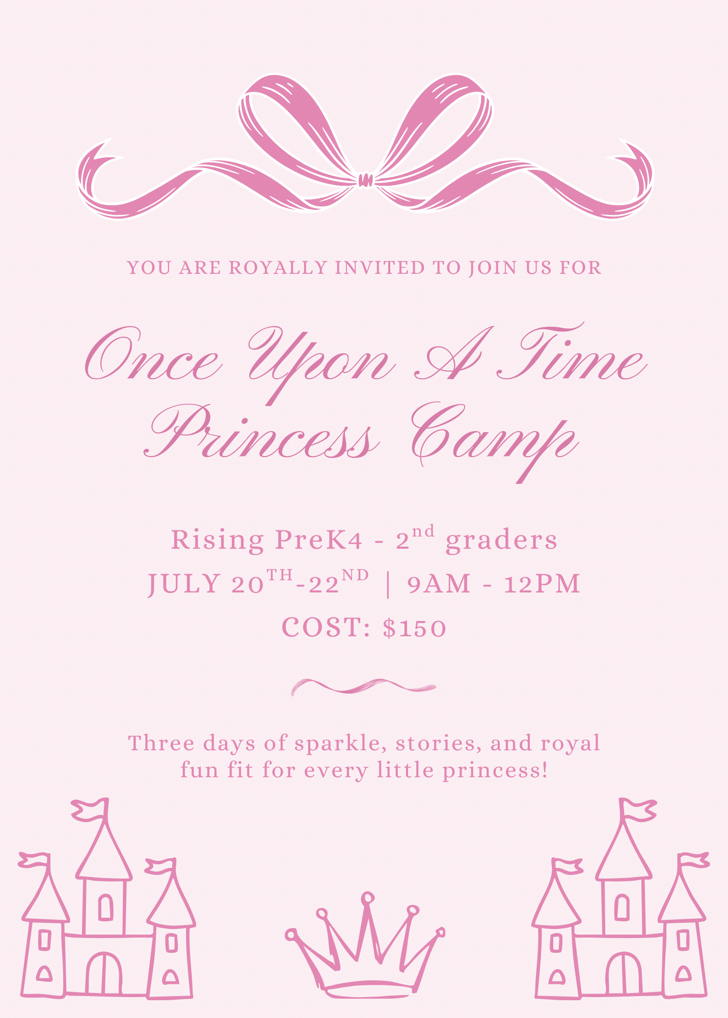 Join us for a magical three-day Princess Camp designed for PreK4–2nd grade students! Campers will enjoy crafts, games, stories, and imaginative play while learning about kindness, confidence, and creativity. Princesses are welcome to dress up each day and are especially encouraged to wear their favorite princess outfit on the final day for our Royal Runway and Coronation Celebration. The camp concludes with dancing, photos, and a special keepsake for each camper.