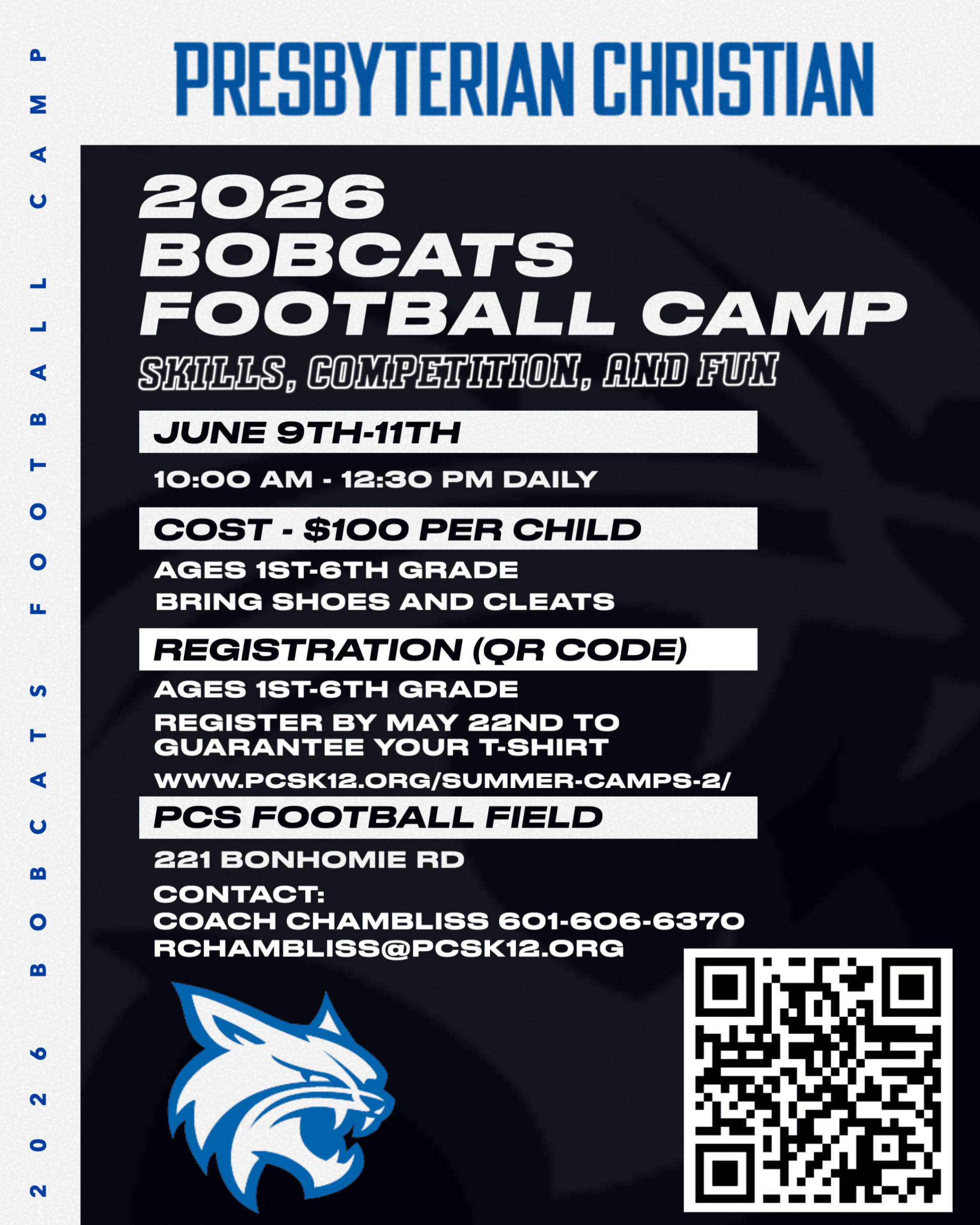 Rising 1st-6th Grade Students – Come learn skills, competition of football with a lot of fun along the way with PCS Head Football Coach Richard Chambliss and his staff.